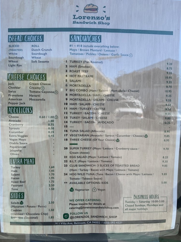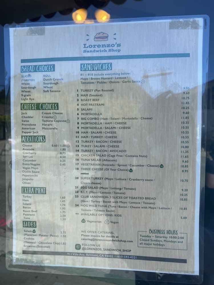 Lorenzo’s Sandwich Shop in Belmont, CA, is a must-visit spot for sandwich lovers. With a wide range of options, including vegan and vegetarian choices, this women-owned establishment caters to all preferences. Customers rave about the fresh and delicious sandwiches, with standout favorites like the turkey bacon avocado on dutch crunch. The garlic spread adds a flavorful twist, and the attentive staff ensures that orders are always correct. Don't miss out on the Belmont treasure that is Lorenzo’s Sandwich Shop, where quality ingredients and friendly service come together to create a memorable dining experience. Whether you're a sandwich enthusiast or just looking for a quick lunch, this place won't disappoint.